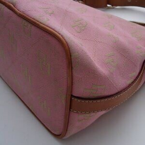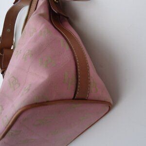 Dooney and Burke signature monogram canvas hobo shoulder bag. Leather handle and trim. Top handle. Gold tone hardware.