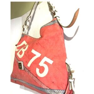 This eye-catching hobo bag features a vibrant red hue and a slouchy silhouette, adorned with bold beige letters for a unique touch. The single shoulder strap and curved bottom add to its stylish appeal, making it a standout accessory for any occasion. Pre-wash denim canvas with leather strap & trim main compartment 2 pockets at interior wall fabric lining exterior have some stains corners have tear lining minor stains hight 13” wide 16” depth 4.5 strap drop 9”The dimensions are based on approximately measurements before placing an order please check take a moment to view all photos using feature for a closer look