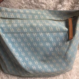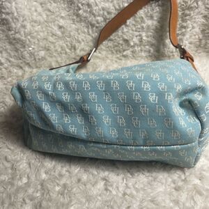 Dooney&Bourke canvas light blue &white logo print leather tan strap shoulder bag