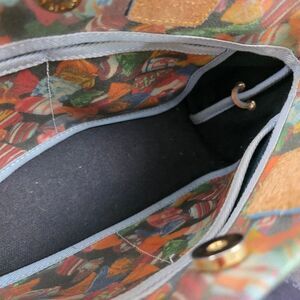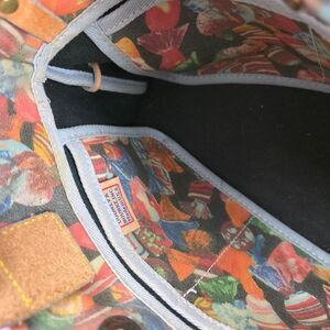 This rare and colorful Dooney & Bourke candy print satchel is a playful collector’s piece, featuring a vibrant allover candy wrapper design. Made of durable coated canvas with leather trim, dual handles, and gold-tone hardware. The signature pink heart logo charm adds a sweet finishing touch.