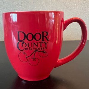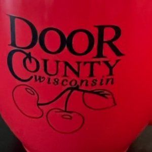 Beautiful cherry red ceramic mug that reads Door County, Wisconsin, above an outline of a cluster of cherries. In case you didn’t already know, the Door County Peninsula in Wisconsin is ideal for growing cherries with its unique climate of cooler spring months and suitable soil composition.