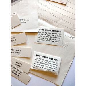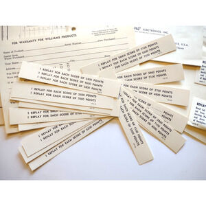 Original vintage pinball machine lot of paperwork. Includes manual, schematic diagram, score value cards, bulletin sheets, mail in card, and envelope. Score cards looks unused. Other items have folds, creases, soiling, and age wear. Envelope has tears and writing.