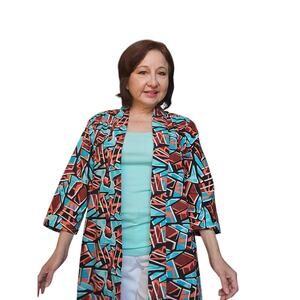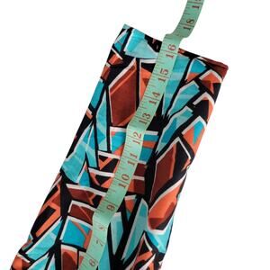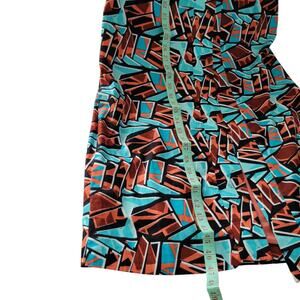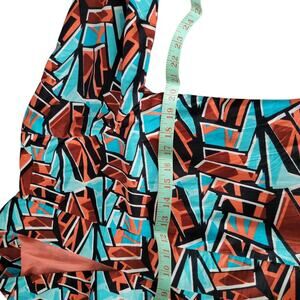 This handmade, not branded long coat in a vibrant orange and turquoise teal color with a retro 1960s psychedelic graphic pattern embodies the mid-century mod style.