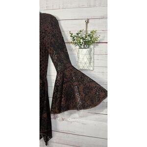 • Brown & Black Sheer Lace | Bell Sleeves | Shark Bite Hem | Ends of sleeves are slit up the bell portion giving a more flared look