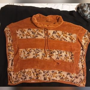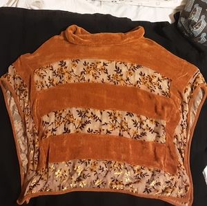 This elegant poncho type top has chenille knit and floral sheer stripes. It measures 40" around the hem and 44" around at the top of the side seam.