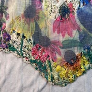 Keywords: Dor Dor Couture, tunic top, floral print, crochet trim, bohemian style, boho, colorful, summer top, festival wear, womens top, size small, acrylic top, beach coverup, lightweight top
