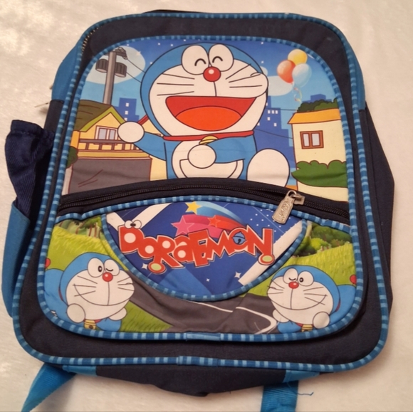 Colorful Doraemon backpack with blue and multicolor design. Features a fun cartoon print.