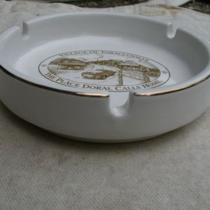 Ashtray from the 1990s. Round. Made of white porcelain with gold leaf paint on the rim. Made for R.J. Reynolds as a premium for buying Doral cigarettes. Inside center has an oval with old style artwork in brown. I'ts a picture of cabins, a welcome sign, and a pickup truck. Around the outside, it says "Village of Tobaccoville" and "The Place Doral Calls Home". Ashtray is 4 1/2 inches in diameter, and 1 inch high. Good condition - no chips or cracks. Design intact. Gold leaf good.