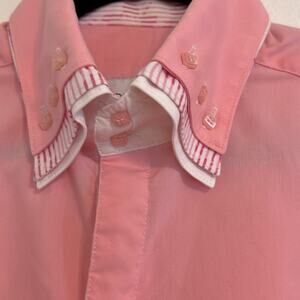 Doramafi made in Italy men’s triple collar dress shirt in bubble gum pink. Only the Italians could made a shirt this beautiful and unusual. The triple collar is made up of one white one pink and white floral and one bubblegum pink collar accented with three square dyed to match pink pearl buttons on each side. The buttons going down the front are in segments of two absolutely amazing.. this is the most beautiful man’s shirt I have ever seen even out does the beautiful Robert Graham shirts.