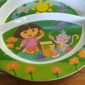 Colorful Dora the Explorer kids plate with green and white sections. Features Dora and Boots with a sunny design.Best friends Dora and Boots Buenos Amigos.