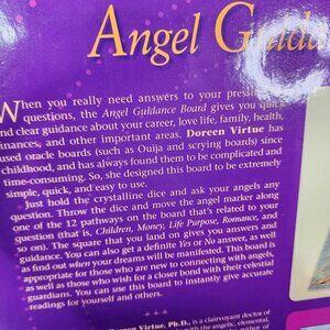 This Angel Guidance Board is a complete set from Doreen Virtue in 2004, featuring crystal dice and a booklet. The board is designed for New Age spiritual guidance and is not handmade. Made in China, this board is ideal for those seeking angelic insight and guidance.