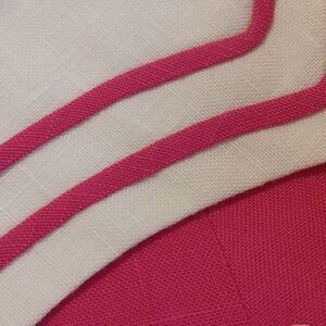 Vintage. Charming pink dress with white embroidered polka dots and a stylish white collar with pink trim. Button front. Bound button holes and covered buttons. Fully lined. Features a matching belt for a flattering fit. Fabric appears to be linen, with no tags. Measures 38 at chest, 33 at waist, self belt to adjust here. 40 at hips. 42 long from shoulder to hem.