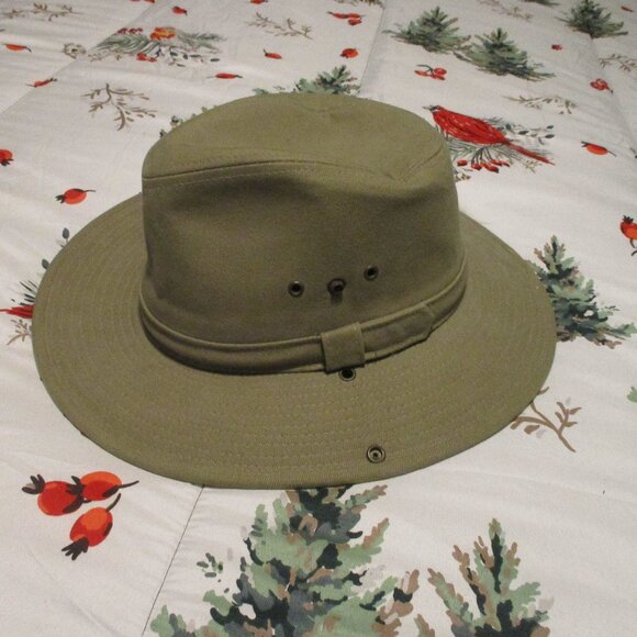 Dorfman Pacific Aussie style sun hat. Side snap on left. Size Large = 3" brim. Material is stiff cotton, holds its shape. Excellent condition.