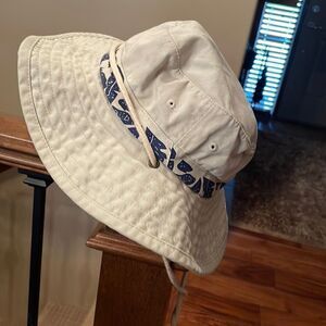 In near new condition. Dorfman Pacific Co. 100% Cotton Hat with Chin Strap. Off White with Navy Print Band. Size Large.