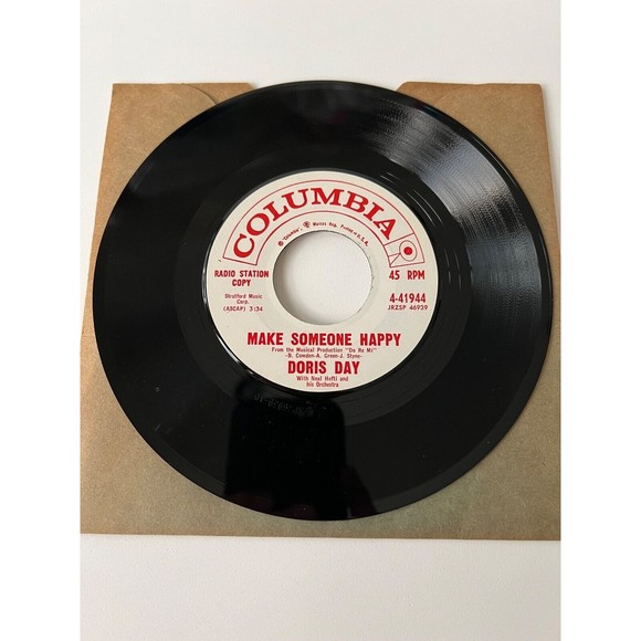 Doris Day's 1961 7" vinyl single "Make Someone Happy / Bright and Shiny" on Columbia Records 4-41944. White label radio station promo copy