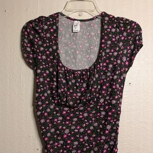 Chic floral print dress with ruched sides. Features a scoop neckline and short sleeves. Perfect for casual outings.