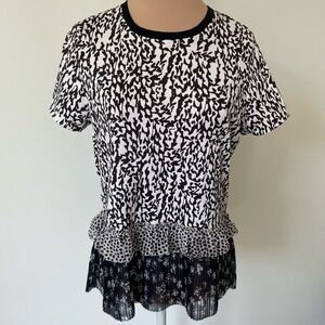 Photos don’t do this justice! Way prettier in person. Gorgeous ruffle top. Top is cotton and ruffles are silk. Mixed patterns that work well together.