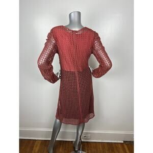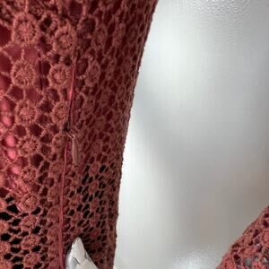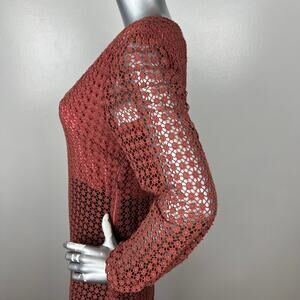 Fabulous dusty rose crocheted dress with two layers of- pink and black peeking through! Perfect with your favorite heels for a night out or vacation dinner. Size 2 is the equivalent to a US size small or 4 according to brand size chart.