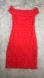 Elegant scarlet lace dress with off-shoulder style. Ideal for formal occasions. Midi length for a refined look.
