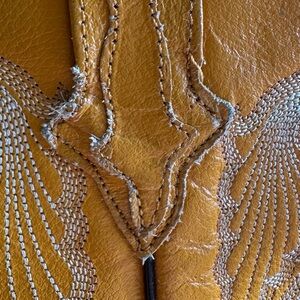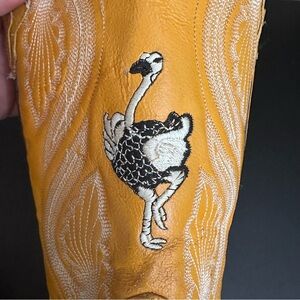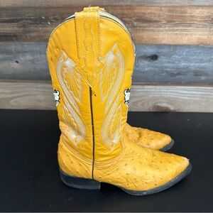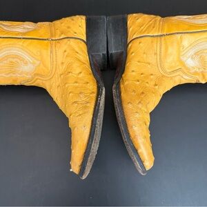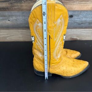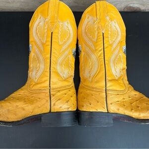 These men’s yellow leather Dos de Oro Mexican boots are a size 7.5 and are in fair premium condition. Please note scuffs on the toe of the right boot as well as flaws at the top, shown in pics. These boots do have an embroidered ostrich on the front and back of each boot. Please see photos as they are part of the description and show the wear and condition of the boots. Questions? Leave a comment below!