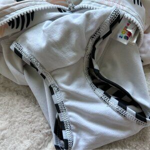 Details: Black, White and Pale Pink Pineapple. Adorable and well made swimsuit. Body of the suit is fully lined. Well thought out design. There is a flap of fabric under the full length of zipper which prevents pinching of skin with use of the zipper.