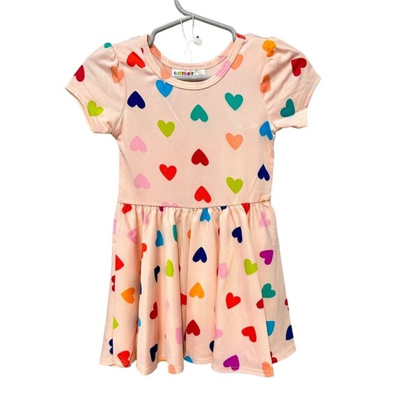 This adorable Dot Dot Smile dress features a colorful heart print on a soft pink background, perfect for adding a touch of fun and playfulness to your little one's wardrobe.