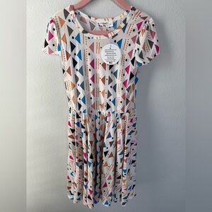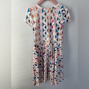 This casual sundress by Dot Dot Smile features a playful geometric pattern in pink and blue. Designed with a crew neck and short sleeves, it offers a comfortable fit with a flowing silhouette perfect for everyday wear.