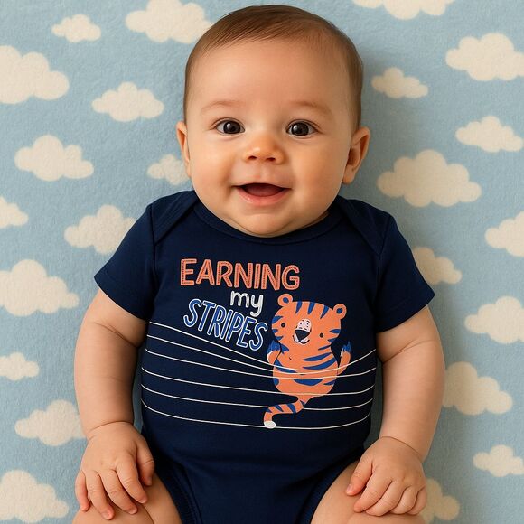 This one-piece features a solid blue color with a fun tiger theme with "Earning My Stripes" screen printed on the front, perfect for casual occasions during the summer and spring seasons.