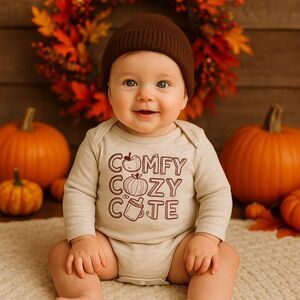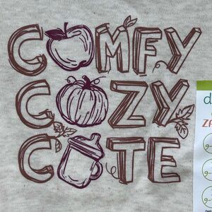 "Comfy, Cozy, Cute" screen printed in block print on the front. With an apple, pumpkin and sippy cup as creative lettering in the middle.
