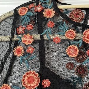 Zara lace dress black with dot lace and ruffle sleeves, beautiful gold colored floral pattern at neck line, black slip underneath, lightweight and beautiful great condition, button in the back to close, slip is attached to dress at the shoulder which is helpful