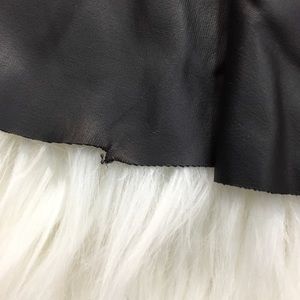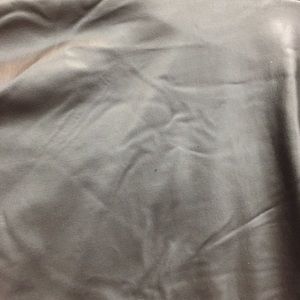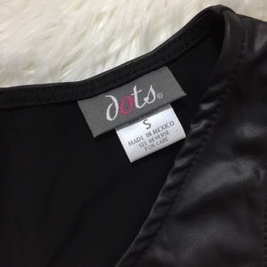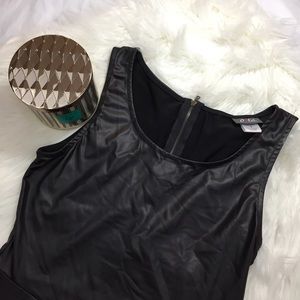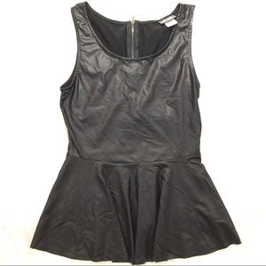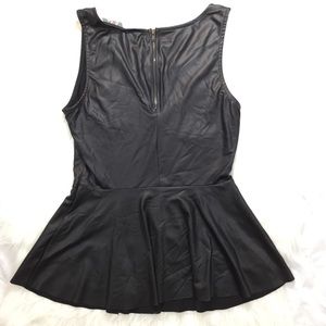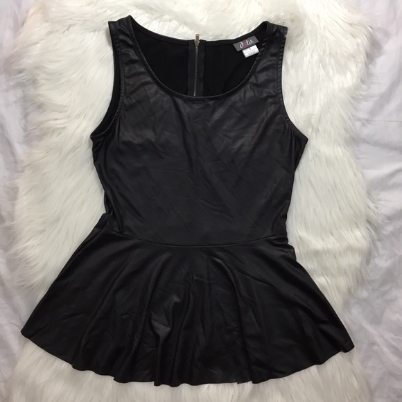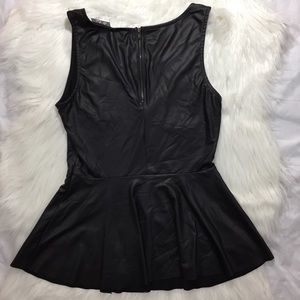In great condition! Small dot on the back that is not noticeable. Also there is a small piece of fabric sticking out on the bottom of the shirt, again unnoticeable. 92% polyester and 8% spandex. Faux leather peplum top.