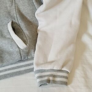 Stylin' gray and white varsity jacket with 2 front pockets and a full zip front! Perfect for back-to-school fall weather!