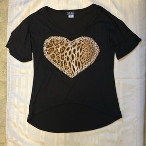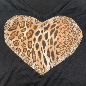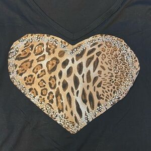 Pre-loved. Worn maybe 2 times. Oversized with a stunning tiger print & aurora rhinestones heart on the front. Stretchy. A “V” neck. Very comfortable. So stunning. Front is shorter than the back by 5 1/4”.