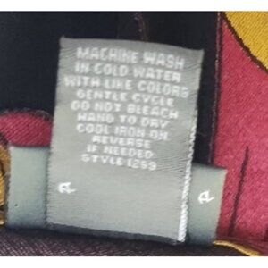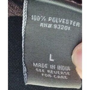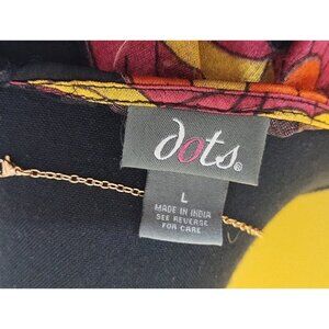 This is very pretty and figure flattering, unique, vibrant colors in black, pretty layered with black or colored tank, great condition, polyester