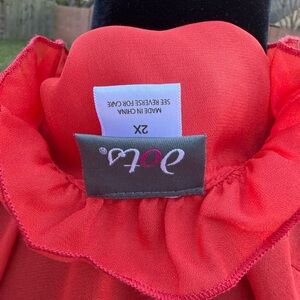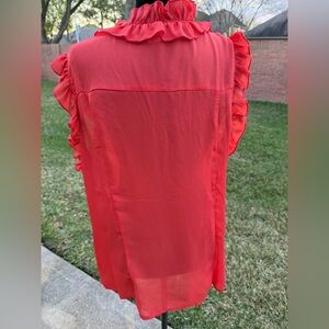 Vibrant red blouse with elegant ruffles. Sleeveless design. Perfect for any occasion.