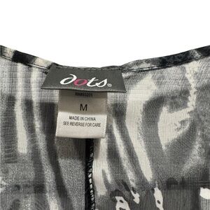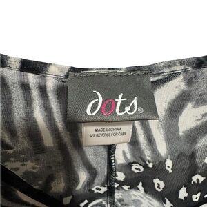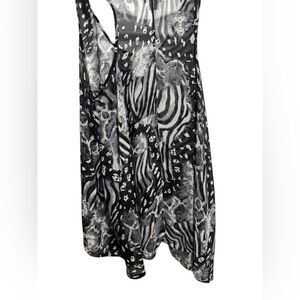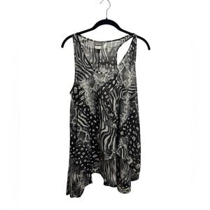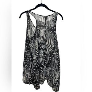 Elevate your layering game with this striking Dots sheer tunic in a bold mixed animal print. Featuring a flowy silhouette, scoop neck, and racerback cut, this lightweight top is perfect for pairing over a tank or bandeau. Black, gray, and white zebra and leopard patterns make it a head-turner. Size Medium. Gently worn, in excellent condition.