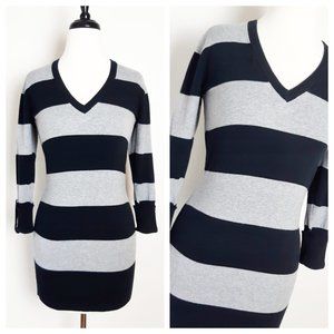 Cute, cozy, and curve-hugging Dots black and gray wide stripe v-neck 3/4 sleeve tunic sweater. Perfect for pairing with leggings and boots.