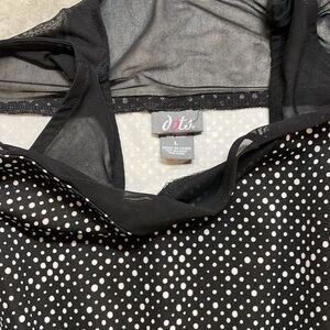 Dots woman sleeveless blouse. Excellent use condition. No stains. No holes or tears. Black and white polkadot. Black mesh trim. Peplum Ruffle. 95% polyester 5% spandex smoke-free home. 24 hour shipping. Open to reasonable offers.