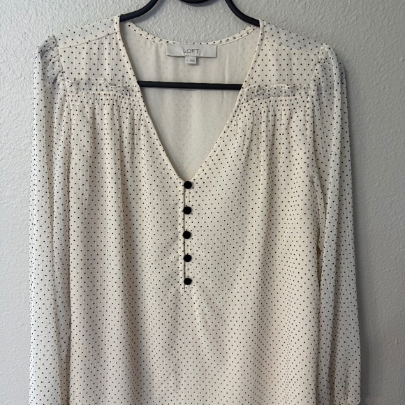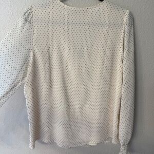 Long sleeve top with black dots and black velvet buttons, fitted at wrist of sleeve, flutter detail on front side
