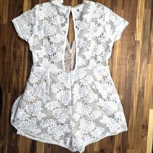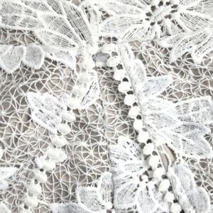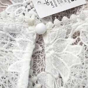 New with tags Dotti mini dress in a creamy white crochet lace with allover floral patterns and a vintage-inspired silhouette. Women’s AU 14 (fits like US L/XL). Features a back keyhole with a pearlized button closure, scalloped hem, and full lining beneath sheer short sleeves. The lace is textured and intricate, giving the whole piece a handmade feel with that dreamy 2000s fairycore twist. Lightweight but structured enough to hold its shape—no stretch, all detail.