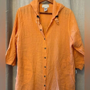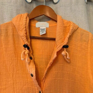"Dotty Cotton Gauze Ezze Wear Outdoors" Size S/P, Light Orange Snap Down with Hoodie. Tunic, Cover-up or top with front snaps, cinch straps.