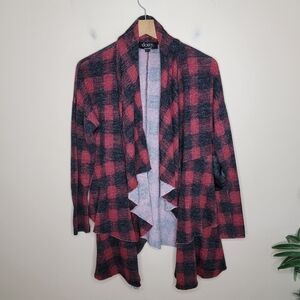 Black & red plaid draped cascade open front cardigan with tiered look.