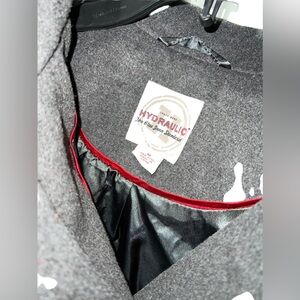 Classic Pea Coat with hood, button up, double gray color with silky lining and 2 front pockets. In like new condition.