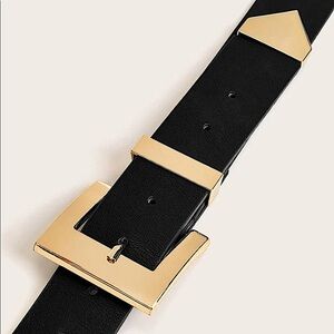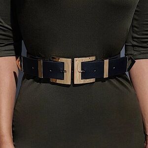 Black and gold double buckle belt. A great addition to your wardrobe. Adjustable on both sides.