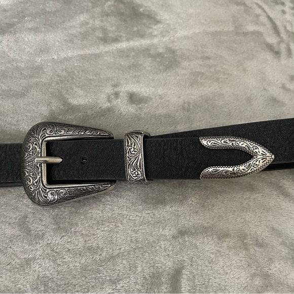 Double Buckle Black Western Belt Silver Hardware Etched Narrow Width Size S/M