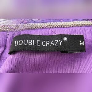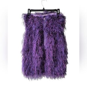 Double Crazy Chic Clear Straps Purple Fuzzy Metallic Faux Feather Mini Dress M. Turn heads with this chic strapless dress in a vibrant purple hue. Its fuzzy texture adds a unique touch to your wardrobe. In excellent pre-loved condition.