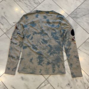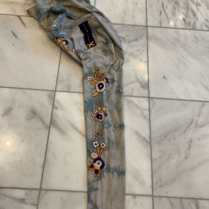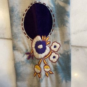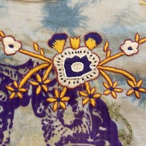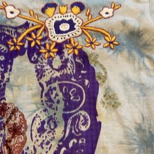 Beautiful Double D Ranch top new but no tag with great detail-embroidery, the “D” is purple velvet as well as some other purple areas, beads , color is silvery with blue tie dye . Marked sample on the inside. New no tag , never worn only tried on. No material tag but I would guess medium weight cotton with maybe 5% stretch .