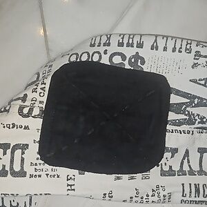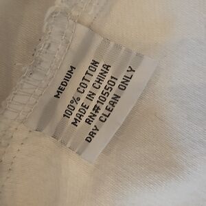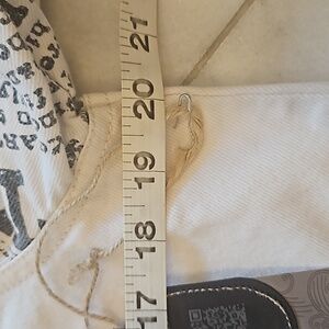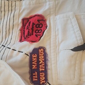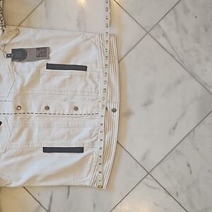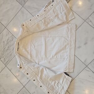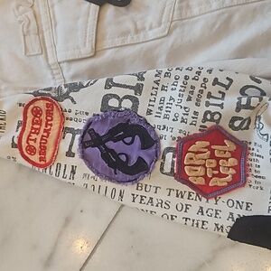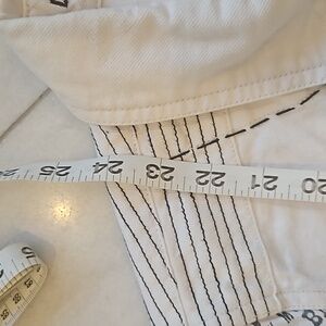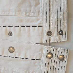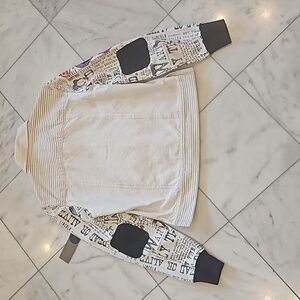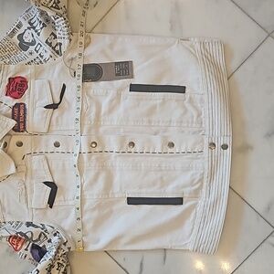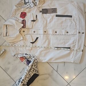 Double D Ranch jean jacket, size medium, white background, black trim ,4 pockets two at chest & two at waist, black whip stitching ,arms are newspaper print wanted The Kid , embroidered patches ,elbow pads , 8 snaps up the front. NWT