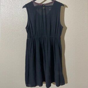 Elegant black mini dress with vibrant embroidered patterns. Sleeveless design. Ideal for stylish outings.