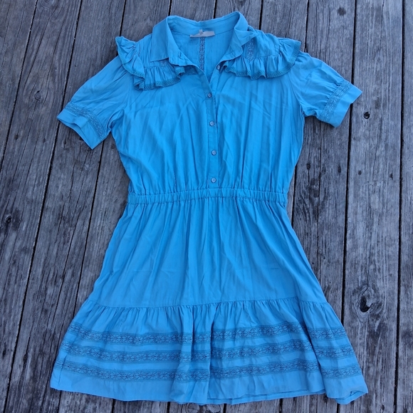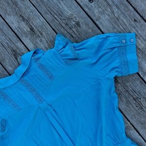 Beautiful Double D Ranch dress in a vibrant turquoise blue. Features soft ruffle detailing at the shoulders and collar, button-front bodice, elastic waist for a flattering fit, and delicate lace trim along the sleeves and hem. Lightweight 100% rayon fabric with an easy drape—perfect for warm weather.